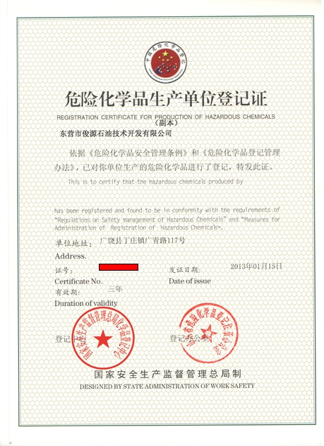 - 國(guó)家高新區(qū)“瞪羚企業(yè)” 高新技術(shù)企業(yè)證書(shū) 山東省“一企一技術(shù)”創(chuàng)新企業(yè) 2015年山東省節(jié)能環(huán)保企業(yè)100強(qiáng) 東營(yíng)市科技進(jìn)步獎(jiǎng) 危險(xiǎn)化學(xué)品登記證 危險(xiǎn)化學(xué)品登記證 山東省企業(yè)技術(shù)創(chuàng)新獎(jiǎng) 安全生產(chǎn)許可證 尊師重教先進(jìn)單位 危險(xiǎn)化學(xué)品經(jīng)營(yíng)許可證 食品生產(chǎn)許可證 全國(guó)工業(yè)產(chǎn)品生產(chǎn)許可證 道路運(yùn)輸經(jīng)營(yíng)許可證